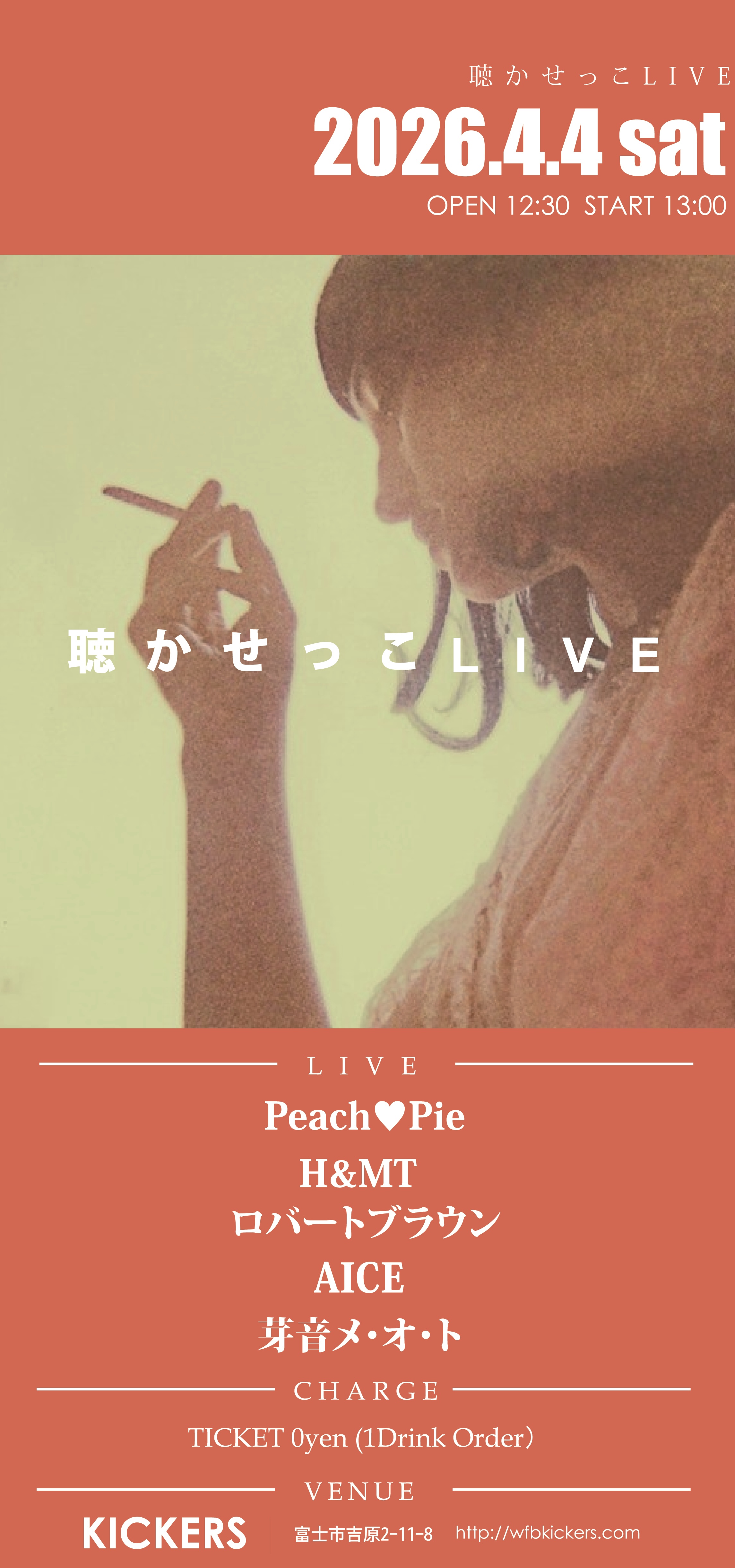 「聴かせっこLIVE」 2026年4月4日(土) open12:30 start13:00 【LIVE】 Peach❤︎Pie H & MT AICE ロバートブラウン 芽音メ・オ・ト 【CHARGE】 チャージ無料 (要1ドリンクオーダー) 【会場】 吉原商店街KICKERS ※チャージフリーです。予約の受付はありません。